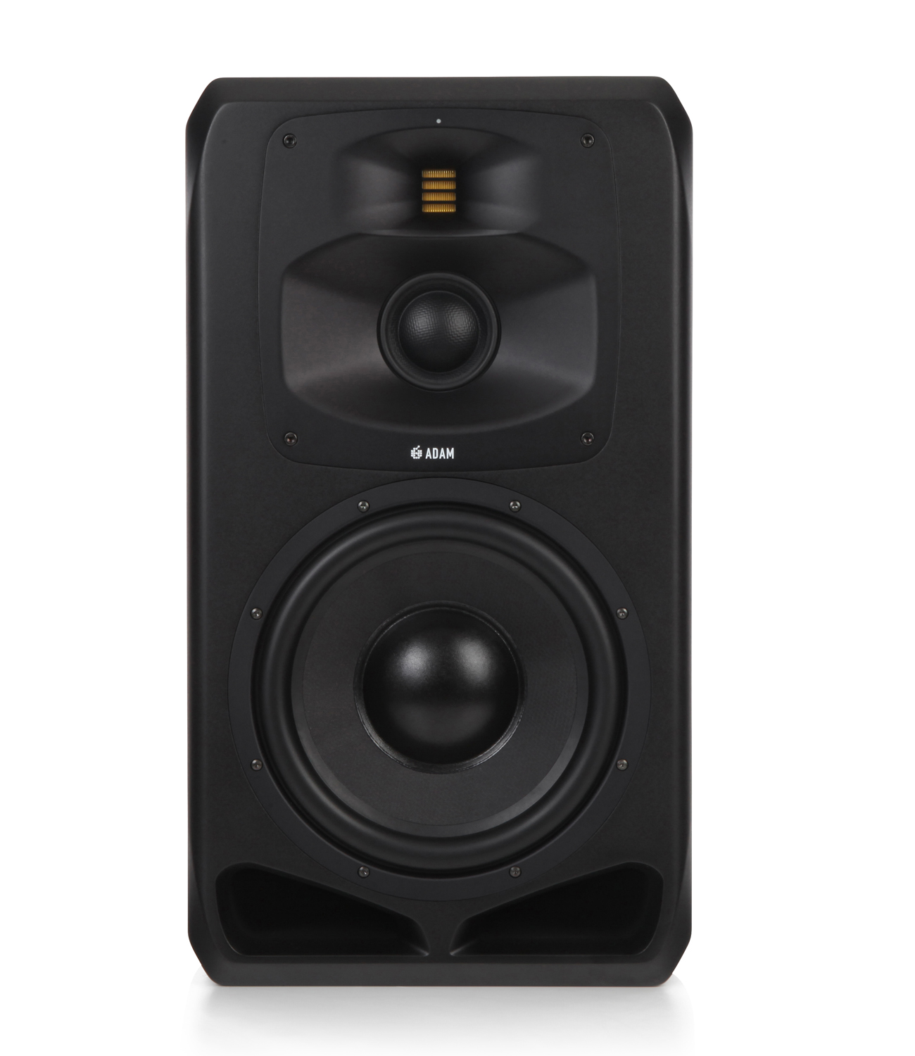 从32 Hz到250 Hz的低频区域由ADAM Audio全新研发的9英寸ELE低频单元负责。此低频单元整合了公司同样具有突破性的SMA对称磁体组件,并提供了精确有力的低频下潜范围,频率覆盖延伸至超低频区域。得益于ADAM Audio新开发的4英寸DCH中频单元和高度精炼的S-ART折叠式带状高频单元的结合使用,使得中频和高频信息的回放表现都达到了极富解析力的高精标准。配合全新HPS波导,增强了高频回放能力,使该款产品具有极其广阔的最佳聆听位置,精细,高清的立体声结像和自然的声场纵深。